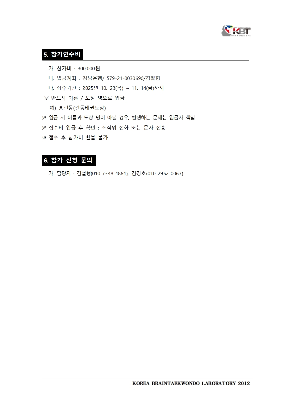 5. ÀÚ°Ý ¿¬¼öºñ °¡. Âü°¡ºñ : 300,000¿ø ³ª. ÀԱݰèÁ : °æ³²ÀºÇà/ 579-21-0030690/±èöÇü ´Ù. Á¢¼ö±â°£ : 2025³â 10. 23(¸ñ) ~ 11. 14(±Ý)±îÁö ¡Ø ¹Ýµå½Ã À̸§ / µµÀå ¸íÀ¸·Î ÀÔ±Ý ¿¹) È«±æµ¿(±æµ¿Å±ǵµÀå) ¡Ø ÀÔ±Ý ½Ã À̸§°ú µµÀå ¸íÀÌ ¾Æ´Ò °æ¿ì, ¹ß»ýÇÏ´Â ¹®Á¦´Â ÀÔ±ÝÀÚ Ã¥ÀÓ ¡Ø Á¢¼öºñ ÀÔ±Ý ÈÄ È®ÀÎ : Á¶Á÷À§ ÀüÈ ¶Ç´Â ¹®ÀÚ Àü¼Û ¡Ø Á¢¼ö ÈÄ Âü°¡ºñ ȯºÒ ºÒ°¡ 6. Âü°¡ ¹®ÀÇ °¡. ´ã´çÀÚ : ±èöÇü(010-7348-4864), ±è°æÈ£(010-2952-0067)