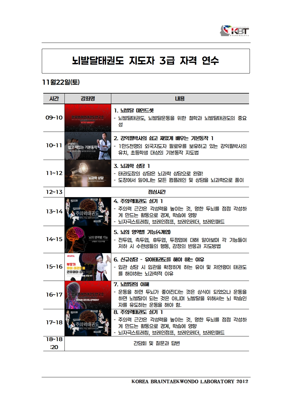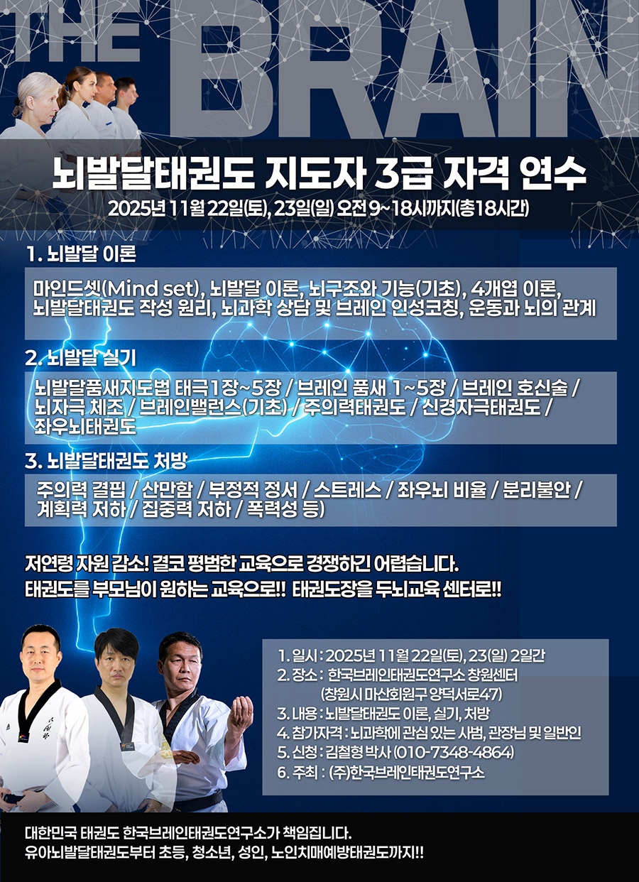 1. ±âº» °³¿ä °¡. ±³À°¸í : ºê·¹ÀÎűǵµÁöµµÀÚ ÀÚ°Ý ¿¬¼ö ³ª. ÀϽà : 2025. 11. 22(Åä) ~ 23(ÀÏ) / 2Àϰ£ 09:00 ¡ 18:00 ´Ù. Àå¼Ò : Çѱ¹ºê·¹ÀÎűǵµ¿¬±¸¼Ò â¿ø¿¬¼ö¿ø ¶ó. ÁÖÃÖ ¹× ÁÖ°ü : (ÁÖ)Çѱ¹ºê·¹ÀÎűǵµ¿¬±¸¼Ò ¹Ù. ÈÄ¿ø : (»ç)¼¼°è¾î¸°ÀÌűǵµ¿¬¸Í Ű¿ø »ç. ±³À° ³»¿ë : ºê·¹ÀÎűǵµ ÀÌ·Ð ¹× ½Ç±â ¡Ø ±³À°±³Àç Á¦°ø – ³ú°úÇÐ »ó´ã ±³Àç, ³ú¹ß´ÞÀÇ ÀÌÇØ, ½Ç±â ±³Àç µîµî